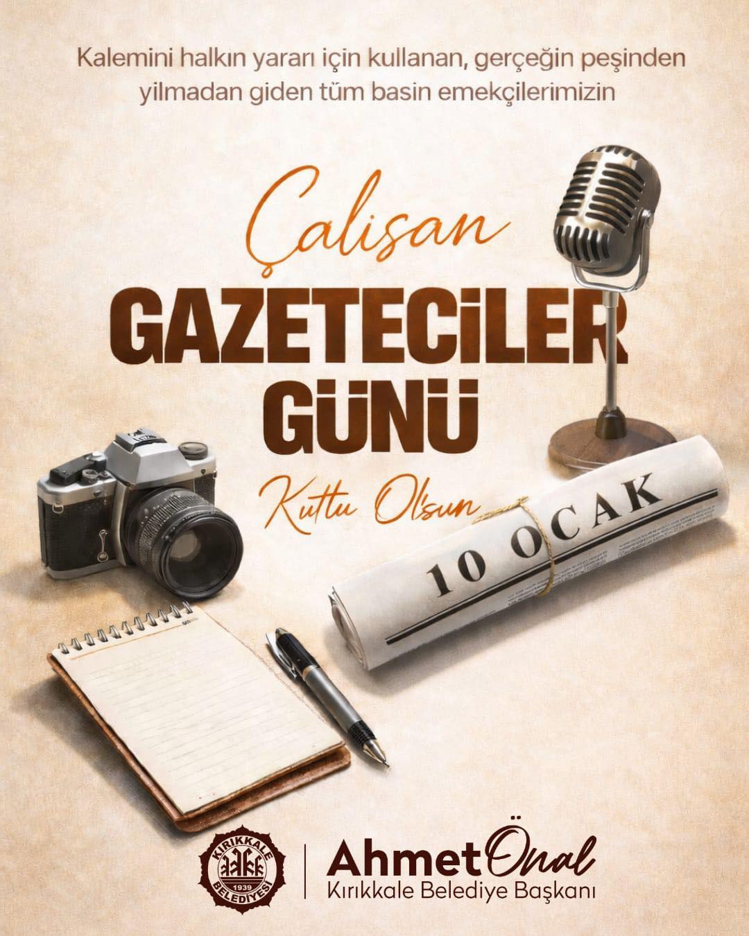 Kırıkkale Belediye Başkanı Ahmet Önal, 10 Ocak Çalışan Gazeteciler Günü dolayısıyla yayımladığı mesajda, gazeteciliğin toplum için taşıdığı hayati öneme dikkat çekti. Başkan Önal, basının toplumun gözü, kulağı ve vicdanı olduğunu vurguladı.
