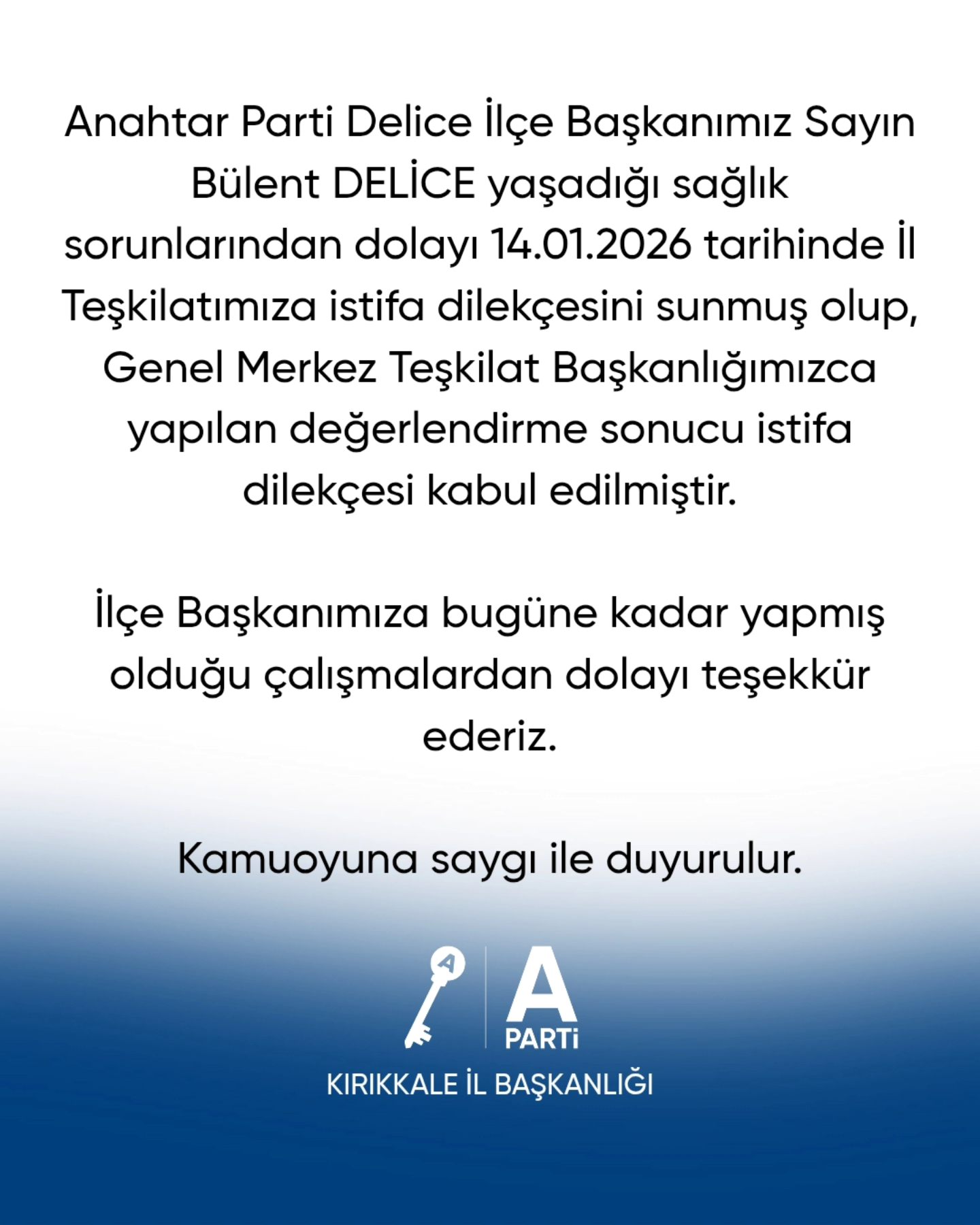 Anahtar Parti Kırıkkale İl Başkanlığı tarafından yapılan açıklamada, Bülent Delice’nin 14 Ocak 2026 tarihinde İl Teşkilatına istifa dilekçesini sunduğu, Genel Merkez Teşkilat Başkanlığı tarafından yapılan değerlendirme sonucunda ise istifa dilekçesinin kabul edildiği bildirildi.