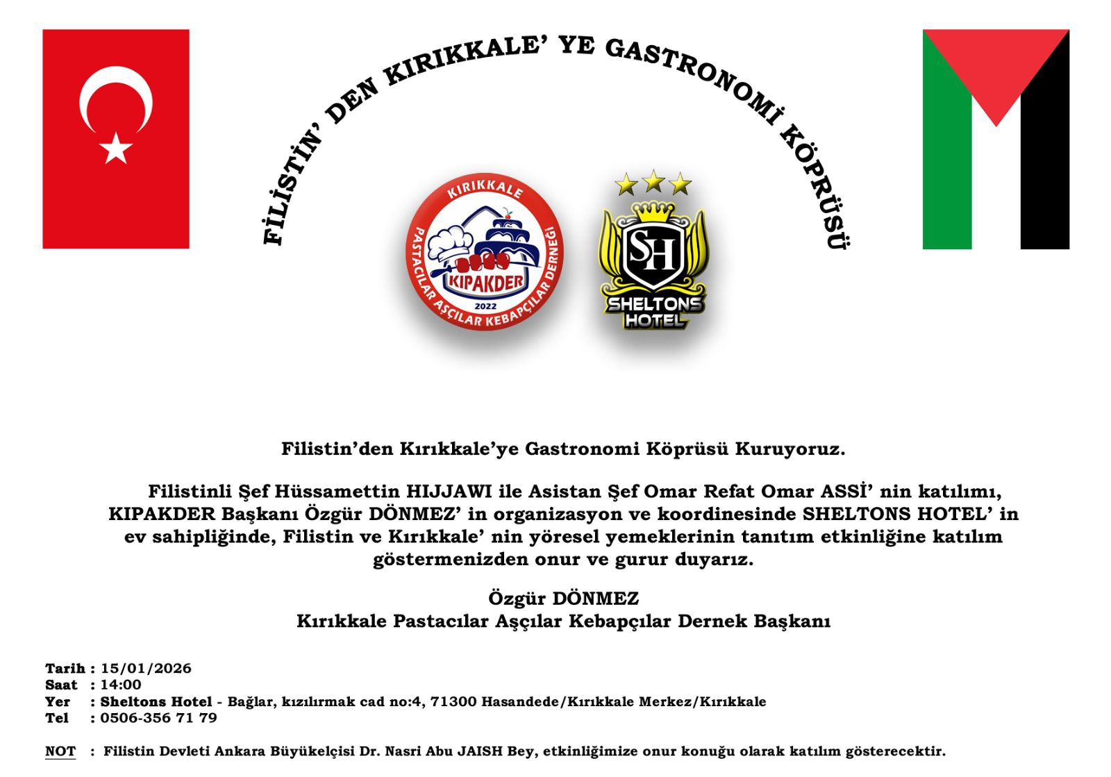 Filistin Devleti Ankara Büyükelçisi Dr. Nasri Abu Jaish’in onur konuğu olarak katılacağı “Filistin’den Kırıkkale’ye Gastronomi Köprüsü” etkinliği, Filistin ve Gazze mutfağının kültürel mirasını tanıtmak ve korumak amacıyla Kırıkkale’de gerçekleştirilecek.