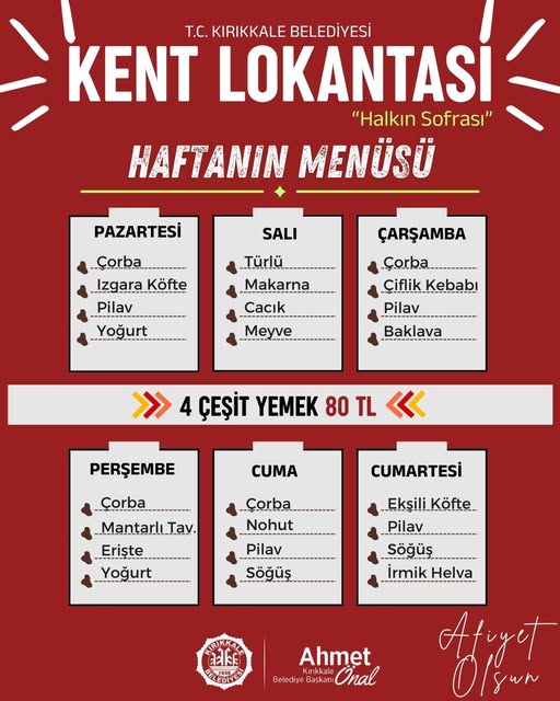Kırıkkale Belediyesi’nin sosyal belediyecilik anlayışıyla hizmet veren Kent Lokantası, uygun fiyatlı ve kaliteli yemek seçenekleriyle haftalık menüsünü açıkladı. “Halkın Sofrası” sloganıyla faaliyet gösteren lokantada, vatandaşlara 4 çeşit yemek 80 TL fiyatıyla sunulacak.