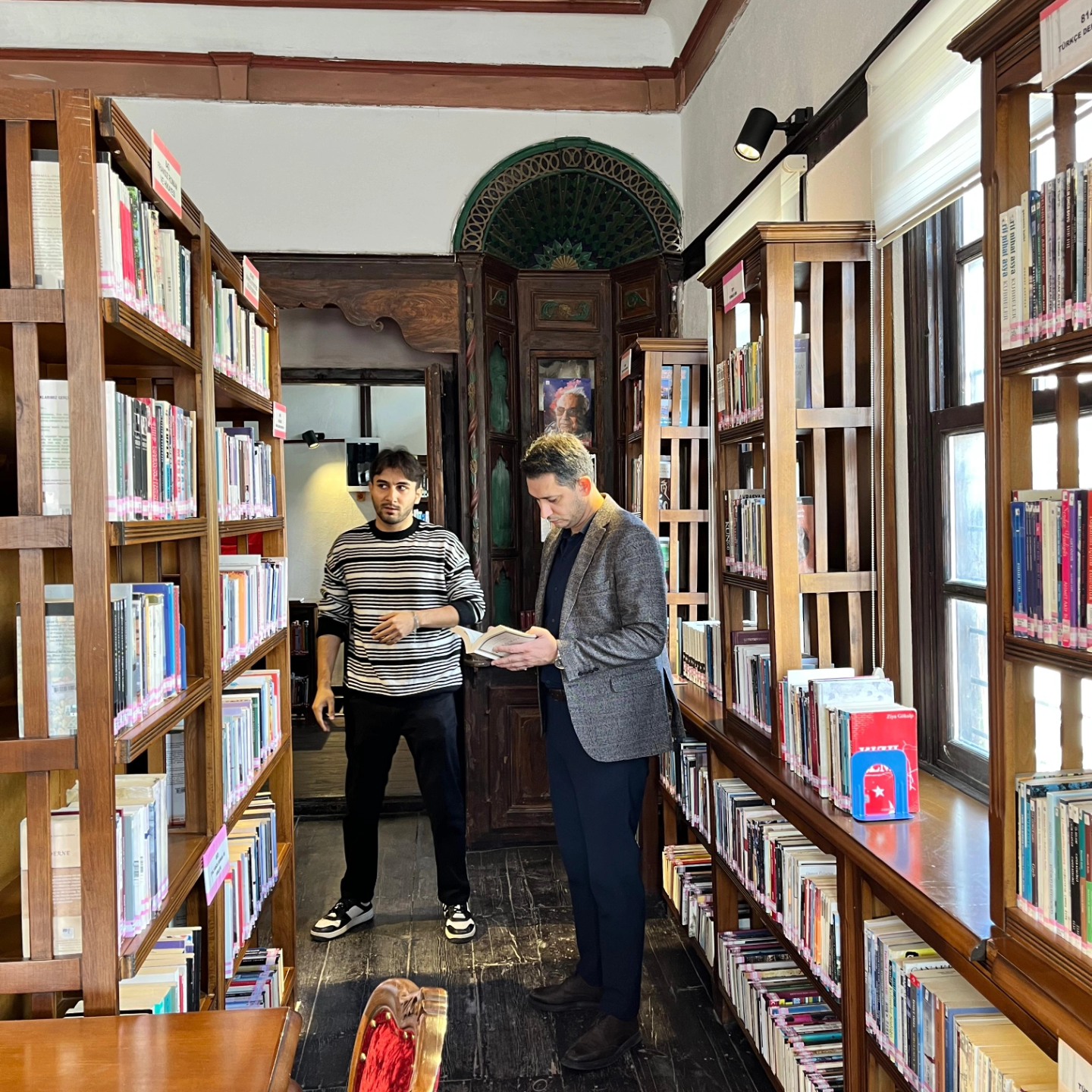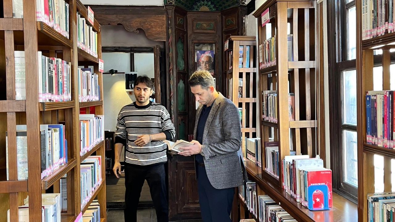 Bilim, edebiyat, tarih, kültür ve sanat alanlarında geniş bir koleksiyona sahip kütüphanede incelemelerde bulunan Kaymakam Kayatürk, Kütüphane Sorumlusu Gökhan Kozan’dan yürütülen çalışmalar hakkında bilgi aldı.