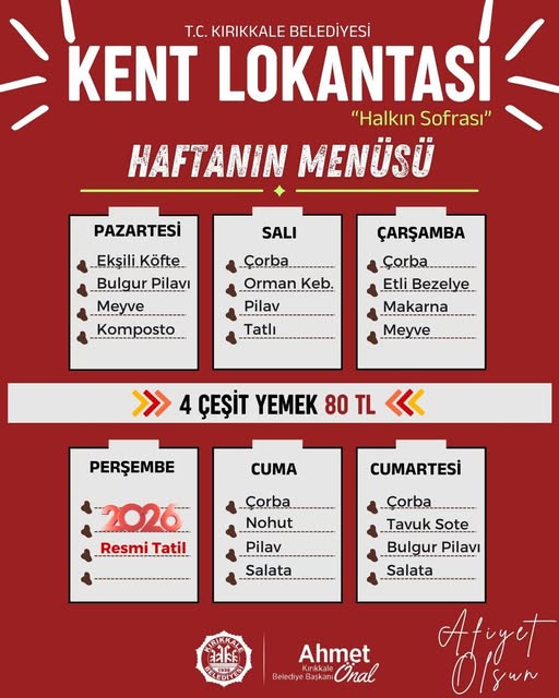 Perşembe günü resmi tatil olması nedeniyle Kent Lokantası hizmet vermeyecek. Cuma günü çorba, nohut, pilav ve salata menüde yer alırken; cumartesi günü ise çorba, tavuk sote, bulgur pilavı ve salata servis edilecek.