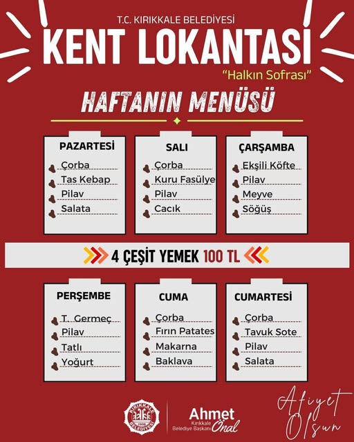 Kırıkkale Belediyesi tarafından hizmete sunulan Kent Lokantası’nda haftanın menüsü kamuoyuyla paylaşıldı. “Halkın Sofrası” sloganıyla hizmet veren Kent Lokantası’nda, haftanın her günü farklı yemek seçenekleri uygun fiyatla vatandaşlara sunulacak.