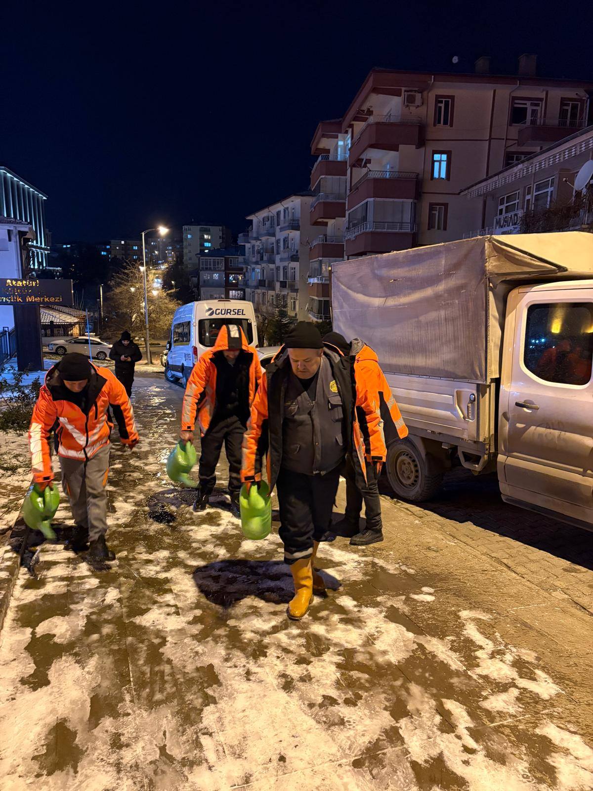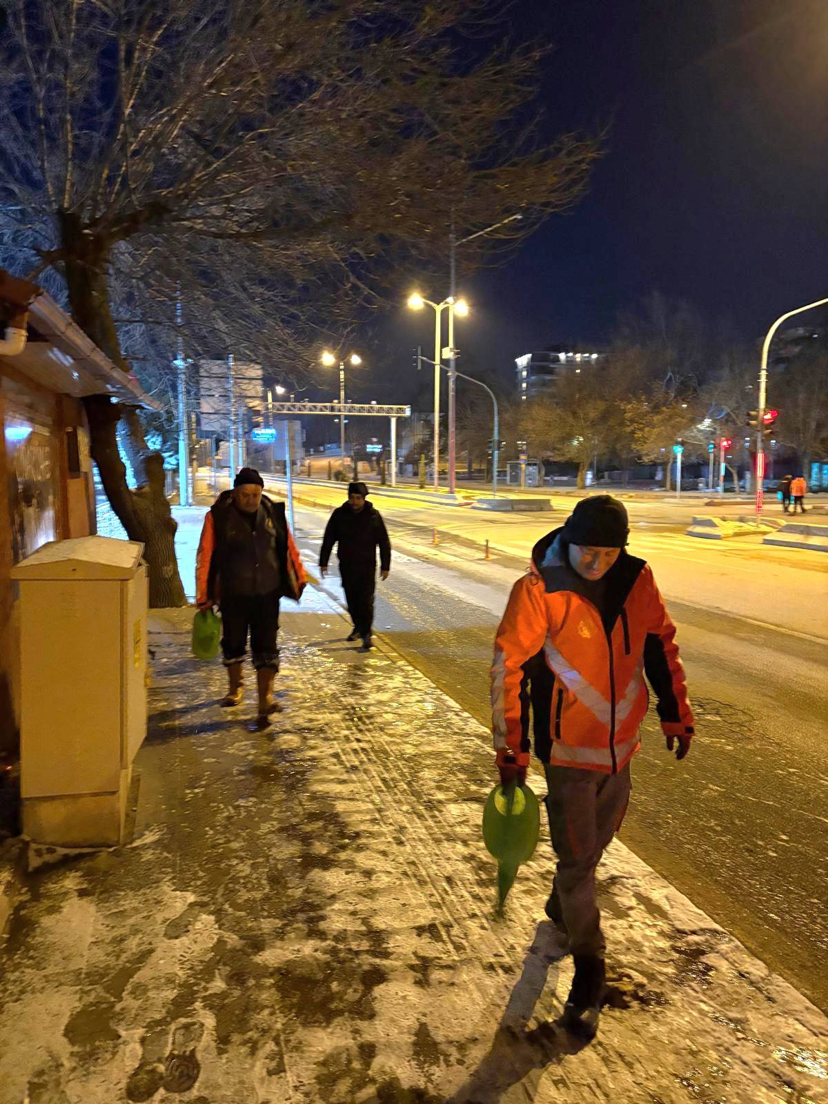 Belediye ekipleri tarafından kent genelinde yürütülen çalışmalarda, özellikle ana arterler, yaya yolları ve riskli bölgelerde buz çözücü solüsyon uygulamaları aralıksız şekilde sürdürüldü. Uygulamaların sabah saatlerine kadar devam ettiği bildirildi.