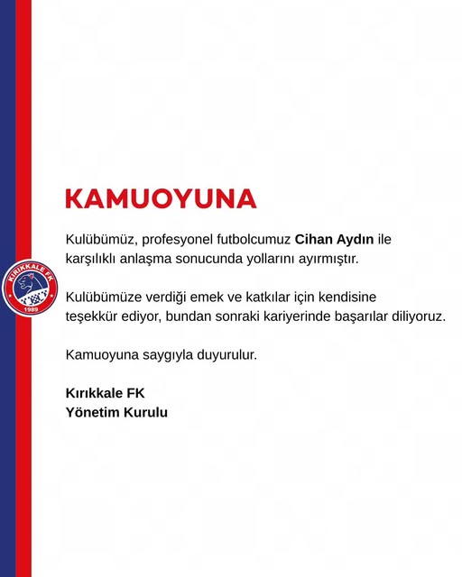 Kırıkkale FK Yönetim Kurulu, kamuoyuna saygıyla duyurdu.