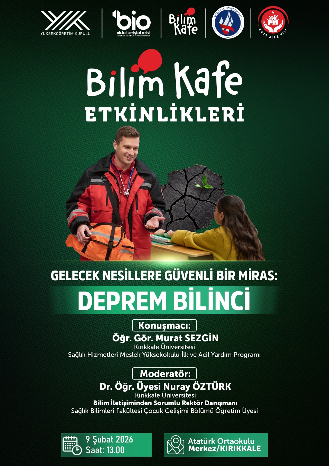 Kırıkkale Üniversitesi, Yükseköğretim Kurulu ile iş birliğinde yürütülen Bilim Kafe etkinlikleri kapsamında önemli bir programa ev sahipliği yapacak. “Gelecek Nesillere Güvenli Bir Miras: Deprem Bilinci” başlıklı etkinliğin, toplumda afet farkındalığını artırmayı hedeflediği belirtildi.