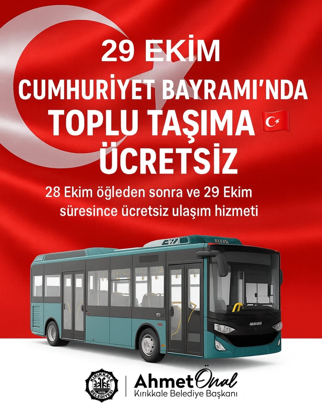 Kırıkkale Belediyesi, 29 Ekim Cumhuriyet Bayramı dolayısıyla şehir içi ulaşımın ücretsiz olacağını duyurdu. Vatandaşların bayram coşkusuna daha rahat katılım sağlaması amacıyla alınan karara göre, belediyeye ait otobüsler ücretsiz hizmet verecek.