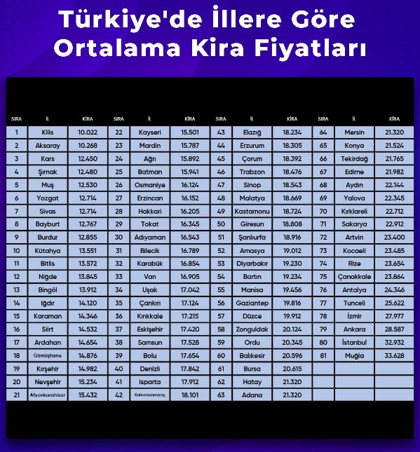 Paylaşılan verilere göre, en düşük ortalama kira bedeli 10.022 TL ile Kilis’te görülürken, Aksaray ve Kars gibi iller de listenin alt sıralarında yer aldı. Doğu ve İç Anadolu’daki birçok ilde kira ortalamalarının 12–16 bin TL bandında yoğunlaştığı kaydedildi.