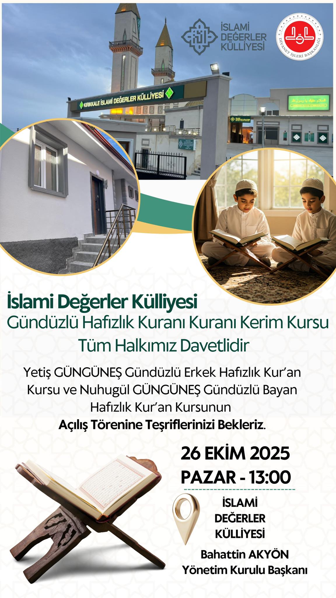 Kırıkkale İslami Değerler Külliyesi Yönetim Kurulu Başkanı Bahattin Akyön, yaptığı açıklamada şu ifadelere yer verdi: