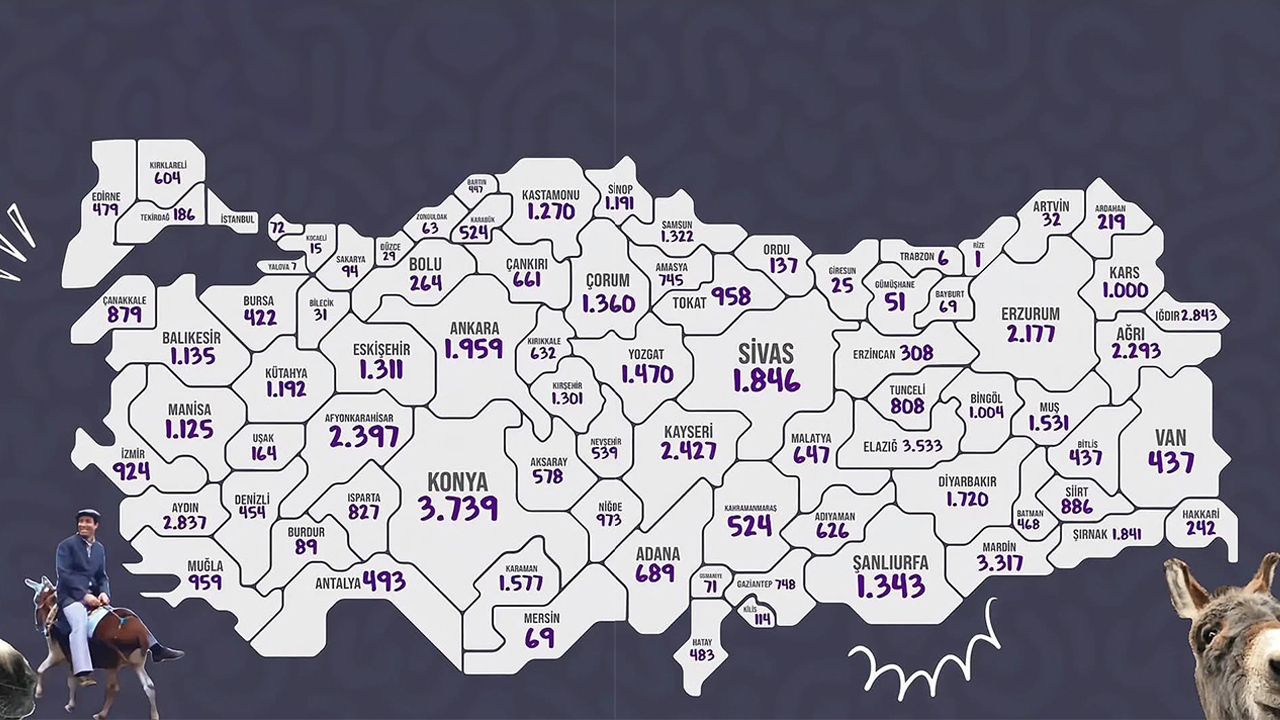 Türkiye genelinde eşek sayısında zirve Konya’ya ait (3.739), onu Aydın (2.837) ve Iğdır (2.843) takip ediyor. Kırıkkale ise 632 eşekle orta sıralarda kendine sağlam bir yer buluyor.