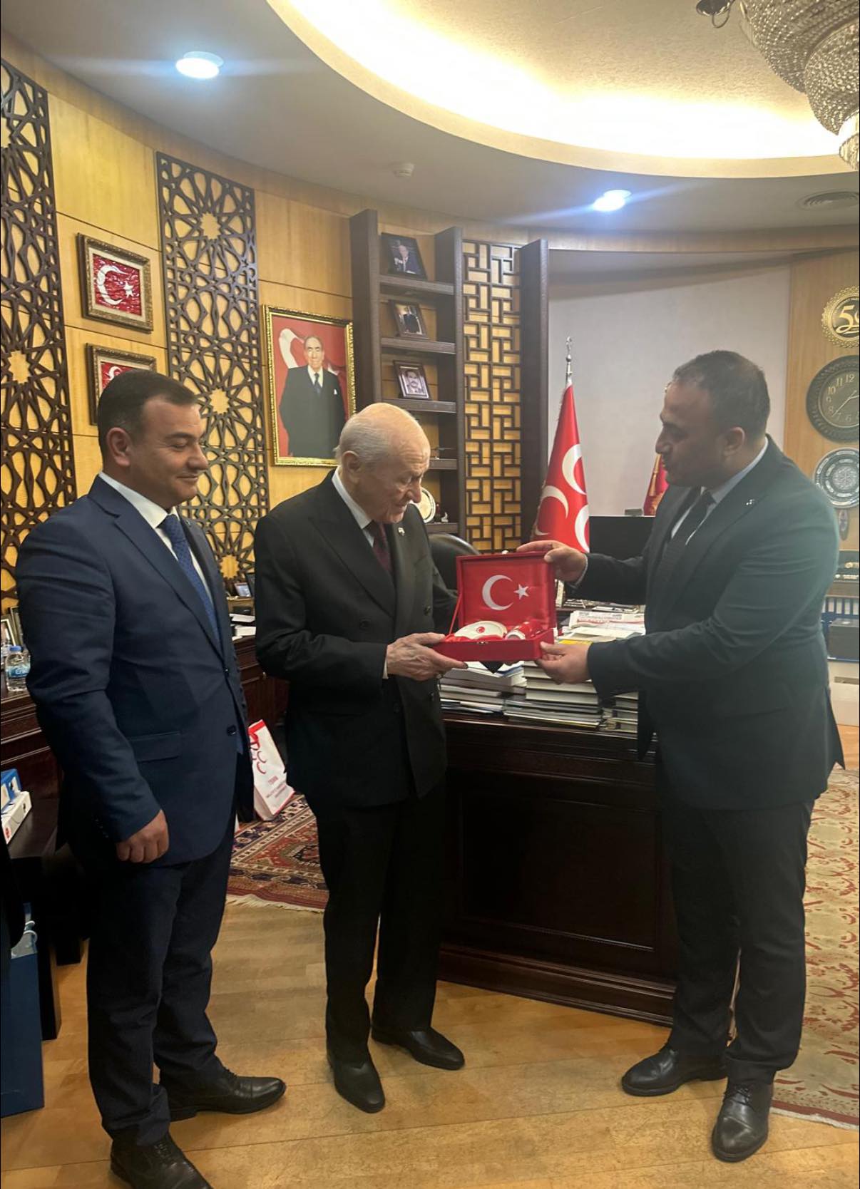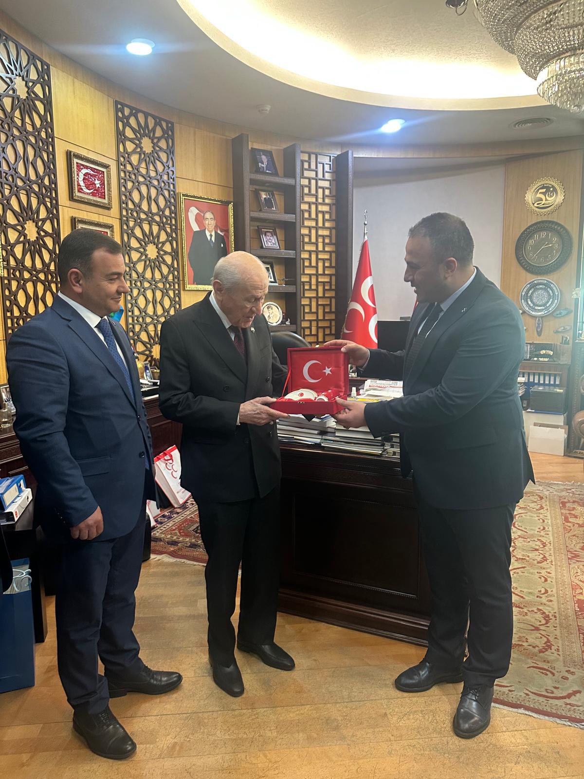 Ziyaret sırasında, üzerinde ay-yıldızlı Türk bayrağı motifleri bulunan özel bir hediye Genel Başkan Bahçeli’ye takdim edildi. İl Başkanı Murat Abalı ve beraberindeki heyet, Bahçeli’nin ellerini öperek hayır dualarını aldı.
