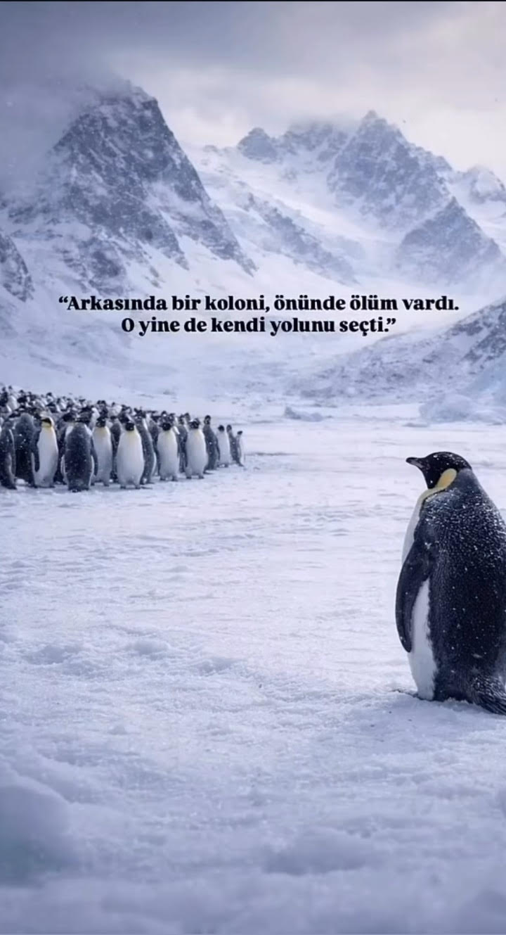 Antarktika’nın uçsuz bucaksız beyazlığında bir penguen, güvenli kolonisinden ayrılıp dağlara doğru yürümeye başladı. Bilim insanları şaşkındı; çünkü o yolun sonunda yiyecek yoktu, su yoktu, hayat yoktu. Sadece kaçınılmaz bir son vardı. O penguen, adeta bir "bilinçle" öleceğini bile bile kendi yolunu seçti.