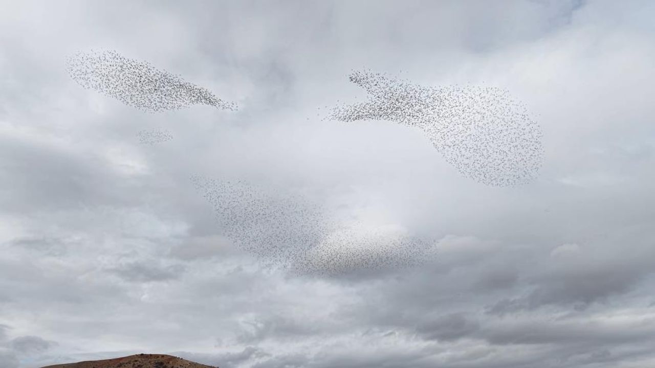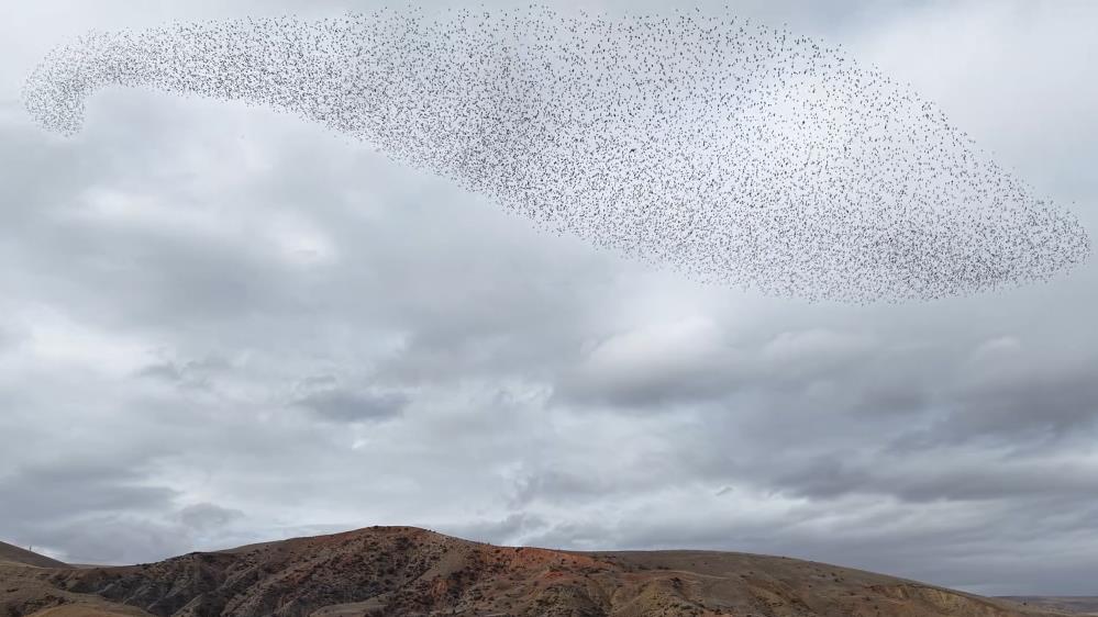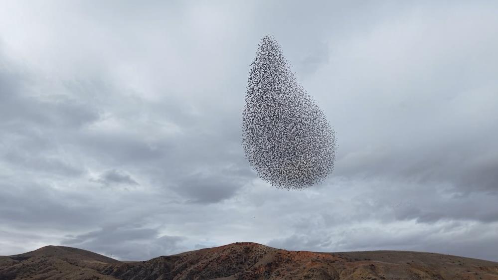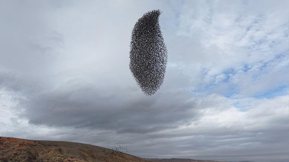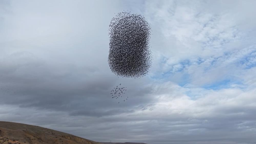 Kırıkkale’de sığırcık kuşlarının sürüler halinde gökyüzünde oluşturduğu şekiller ve ani dönüşlerle sergilediği hareketlilik, görsel şölen oluşturdu.