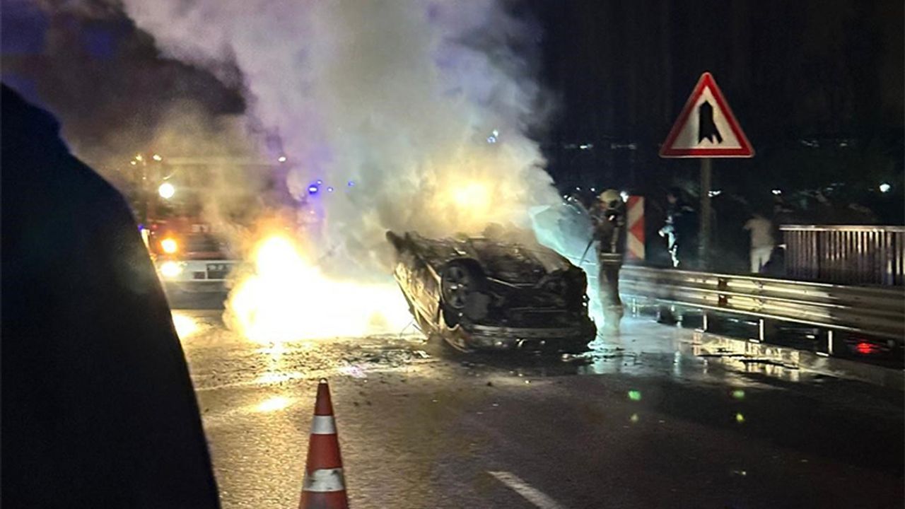 Kontrolden çıkan araç, orta refüje çarpıp takla attı. Kazanın ardından alevlere teslim olan araçtaki iki kişi ağır yaralandı.