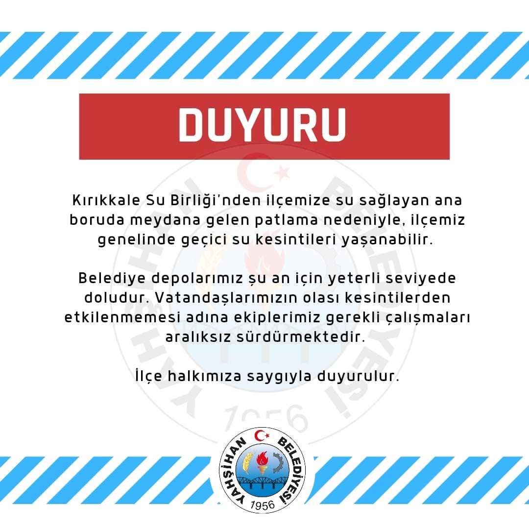 Yahşihan Belediyesi, Kırıkkale Su Birliği’nden ilçeye su sağlayan ana boruda meydana gelen patlama nedeniyle ilçe genelinde geçici su kesintileri yaşanabileceğini duyurdu.