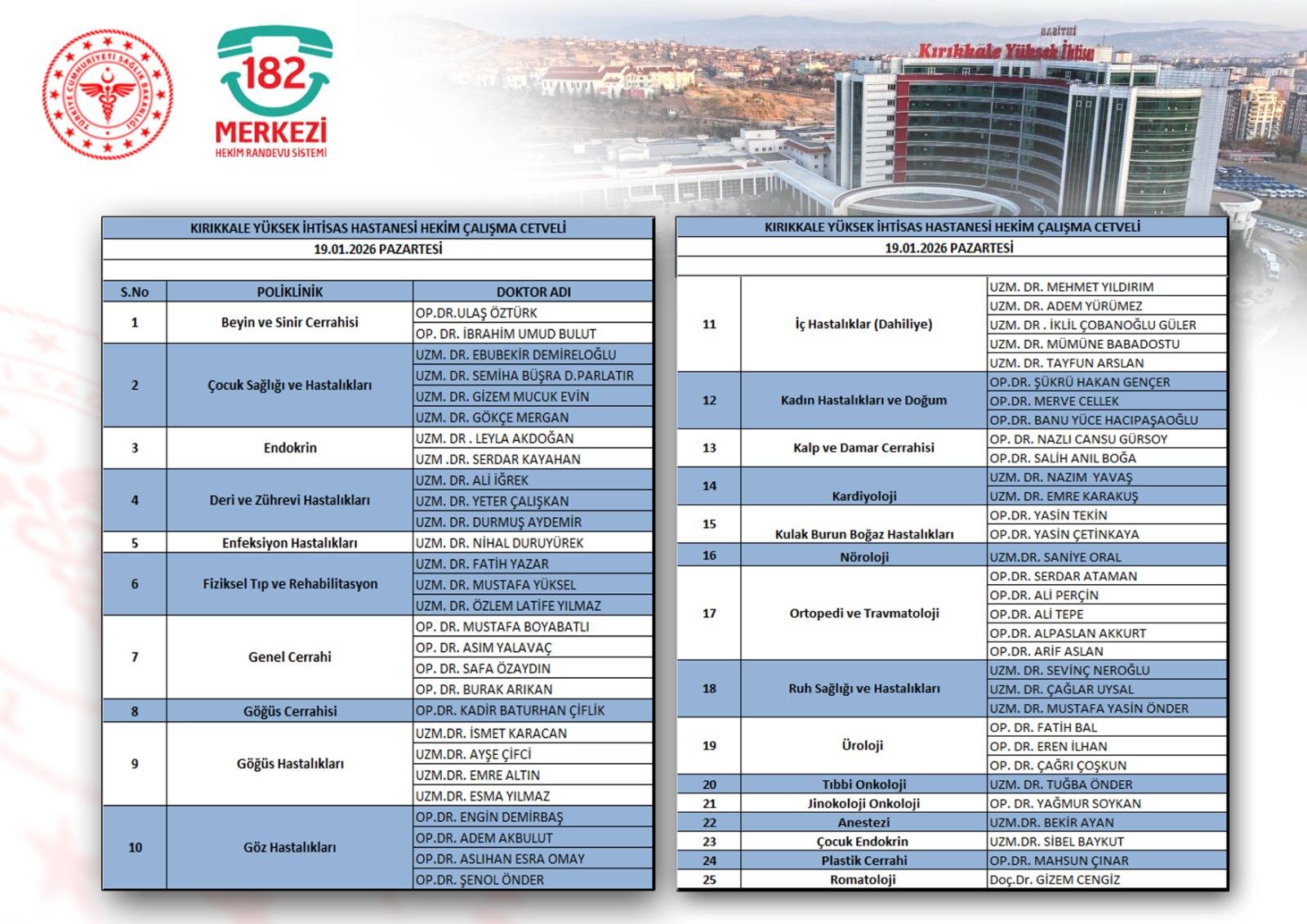 Kırıkkale Yüksek İhtisas Hastanesi’nin 19 Ocak Pazartesi gününe ait hekim çalışma cetveli kamuoyuyla paylaşıldı. Açıklanan programa göre hastanede çok sayıda branşta poliklinik hizmeti verilecek.