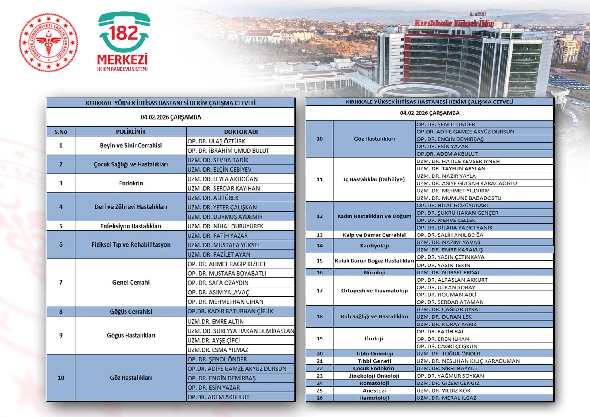 Kırıkkale Yüksek İhtisas Hastanesi tarafından yapılan açıklamaya göre, 4 Şubat 2026 Çarşamba polikliniklerde görevli doktorların isimleri şu şekilde: